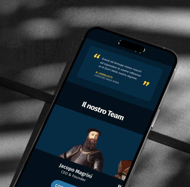 Il design (interaction e UI) si è sviluppato attraverso wireframe, prototipi iniziali e un prototipo ad alta fedeltà, simulando l'esperienza utente. Fondamentale è stato il dialogo continuo con Artsupp: ogni fase è stata condivisa, discussa e validata con i dati. Questo approccio iterativo, unito a sessioni di design critique interne al team, ha permesso di apportare modifiche e miglioramenti costanti, garantendo un risultato in linea con le aspettative del cliente e con le esigenze degli utenti.
